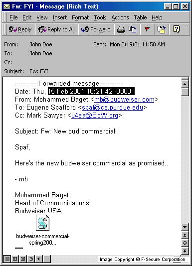 Subject: Fw: FYI Body: ---------- Forwarded message ---------- Date: Thu, 15 Feb 2001 16:21:42 -0800 From: Mohammed BagetTo: Eugene SpaffordCc: Mark Sawyer Subject: Fw: New bud commercial! Spaf, Here's the new budweiser commercial as promised.. - mb Mohammed Baget Head of Communications Budweiser USA Attachment: budweiser-commercial-spring2001.mpeg.vbs