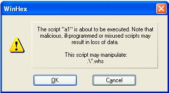 The virus contains less than 20 commands that allows it to look for all available .WHS (WinHex script) files and to prepend itself to them. As a result all infected scripts stop working until the virus' code is removed from them.It should be noted that WinHex shows a warning before running any script, so the virus can not replicate without user's interaction: