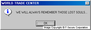 Once installed, the worm changes the startup page of Internet Explorer to point to the worm's file at "c:\Windows\WTC32.scr". After performing its mass-mailing routine, the worm displays one or more message boxes with different messages, for example: