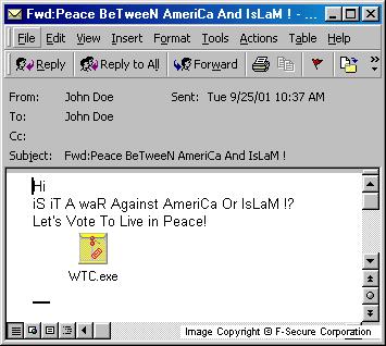 From: name-of-the-infected-user To: random-name-from-address-book Subject: Fwd:Peace BeTween AmeriCa and IsLaM ! Hi iS iT waR Against AmeriCa Or IsLaM !? Let's Vote To Live in Peace! Attachment: WTC.exe