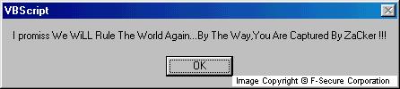 ZaCker.vbs first deletes all files from the Windows folder. It then displays a message:
