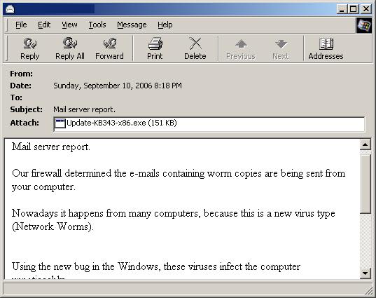 The worm sends itself as an attachment to the gathered email addresses using the following email format: