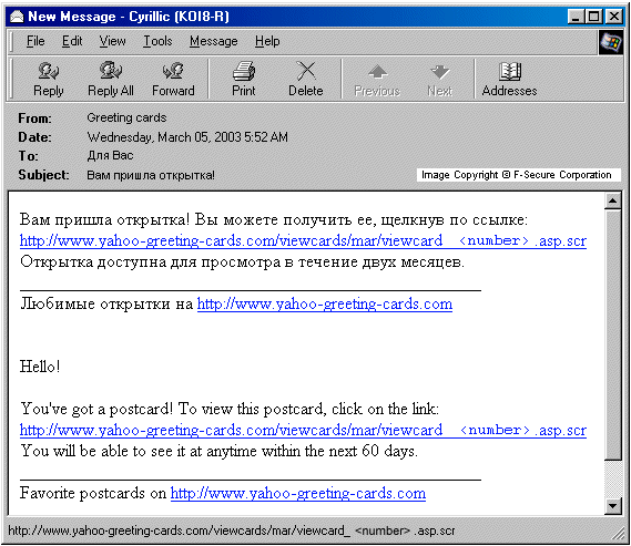 In the beginning of March 2003 there appeared the 3-component trojan that stole information from WebMoney users. WebMoney is the service that allows its users to transfer money anywhere in the world or to pay for goods in webshops. The creators of the trojan spread it in Russia first.