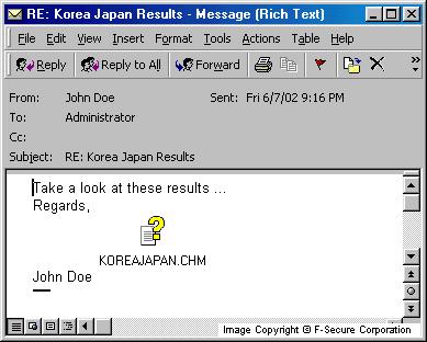 Chick.F is not considered to be a threat as the worm sends itself only once per infected system and only to a single recipient. This variant of Chick worm disguises itself as World Cup 2002 results.