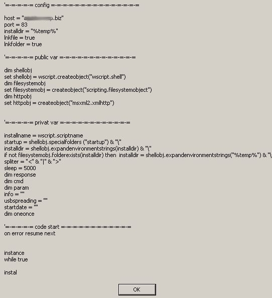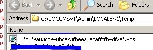 The worm code itself is usually contained in a randomly named VBS file. For example, in one sample analyzed (SHA1: 01fd0f9a83cb940bca23fbeea3ecaffcfb4df2ef), the file names used were: wkzzfsryji..vbs, wkzzfsryji..vbs.bak, clean.vbs, accounts.vbs and ygnwqkwufy.vbs. The worm files are obfuscated (using base64 encoding) to prevent casual analysis of the script.