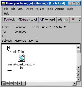 The worm then copies itself to Windows directory using a constant file name "AnnaKournikova.jpg.vbs" and sends itself to allrecipients on all address books. It also adds a marker to the registry, so it will not mass mail again.At January 26th, the worm will open the web browser and connects to an innocent Netherlander web site.