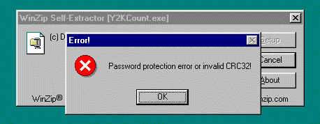 The email was definitely faked, but the trick worked and a number of users launched the attachment and became infected. The attachment - Y2KCount.EXE is a self-extracting ZIP archive that contains installation pack for the new Internet trojan. The archive has 5 files (PROJECT1.EXE and 4 DAT files) and the PROJECT1.EXE file serves as an installer for the trojan. When run the Y2KCount.EXE shows a fake error message: